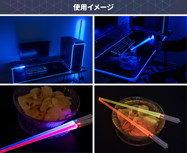 其實這個筷子,是以「電競風」的方式打造,對於電腦熱愛的朋友相信看到這種 RGB 光芒就有種莫名的吸引力。官方在宣傳照片上也以電競配備為背景拍攝,可以看到在黑夜中使用這個筷子就能看到閃耀的光芒,或許適合愛好電競的玩家使用 ( ? ) ,售價也不貴,僅 580 日圓。