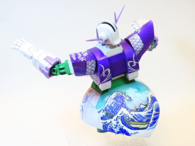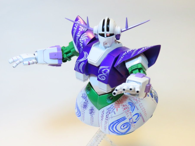 推主 taka-Hi-road 是一位愛好組裝模型跟花卉的女玩家,這個吉翁克她採用了四月至五月盛開的「紫藤花」作為靈感,並結合浮世繪大師葛飾北齋作品《神奈川沖浪裏》做塗裝,機體採用 HGUC 的吉翁克,大小適中。