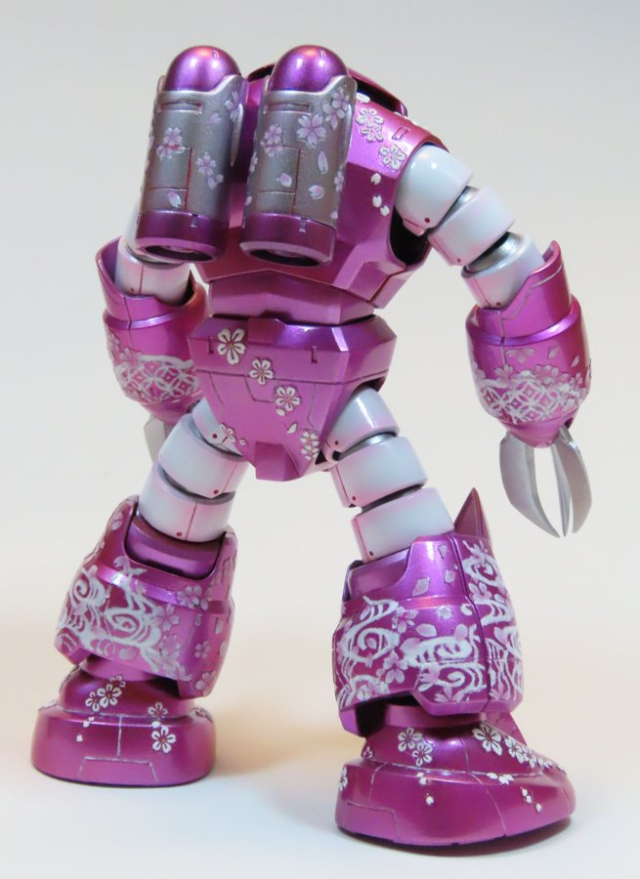此外,她先前也製作了吉翁軍的量產 MS 茲寇克,全部重新上色塗裝上櫻花花瓣的圖騰,氣息完全跟在動畫作品中跟連邦大戰的茲寇克完全不同。塗裝上她也表示她是使用壓克力顏料配合筆刷塗上,由於 HGUC 的大小其實要掌握好圖案並不容易,尤其是細部的畫工,不過平常就有繪圖嗜好的她來說其實還算輕鬆 XD。