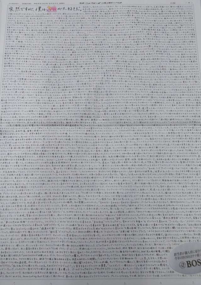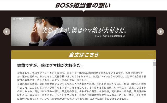 先前我們報導過日本三得利旗下的飲品品牌 BOSS 與話題手遊《賽馬娘Pretty Derby》 合作,當時就在官網表示 BOSS 開發負責人對馬娘的熱愛與合作的心願終於實現。沒想到今日 ( 5/27 ) 更在產經體育的報紙登了滿版廣告,內容是開發負責人手寫的「萬言書」表達對馬娘的愛意,讓不少網友吃驚,瞬間成為網路議題。