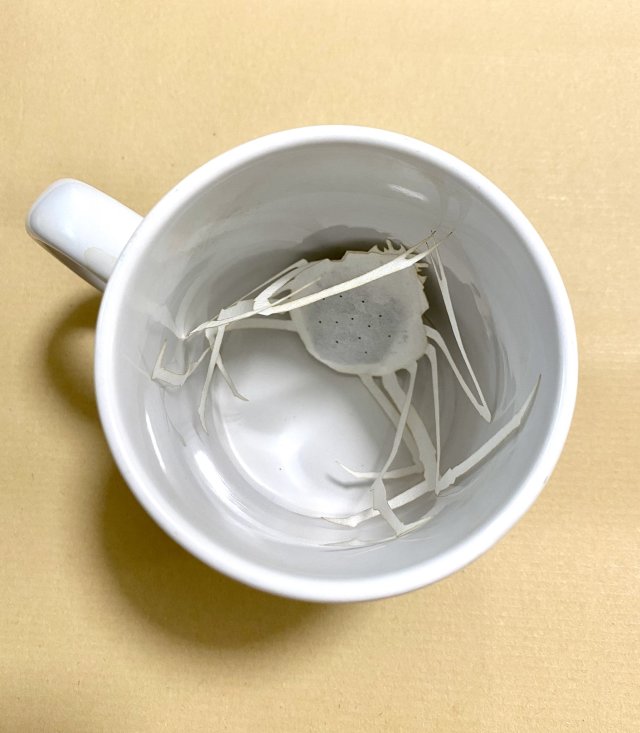 推特網友「riya」貼文,表示朋友送了他「甘氏巨螯蟹」(高腳蟹/タカアシガニ)的造型茶包,明明裡面只是普通的蘋果茶,外觀卻充滿了衝擊力。尤其是放進杯子裡以後,總覺得讓人有種把茶包看成超大昆蟲的錯覺……
