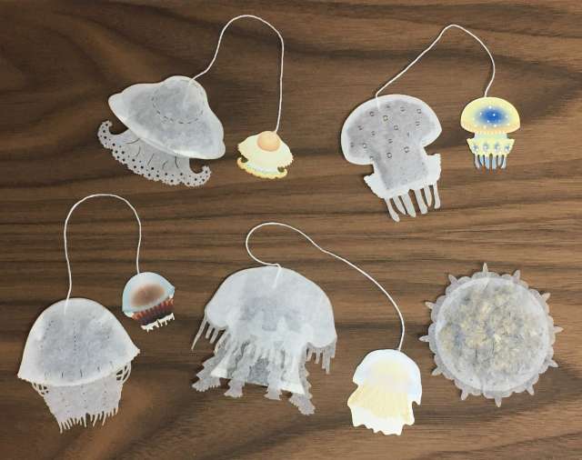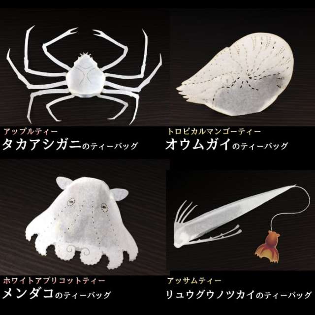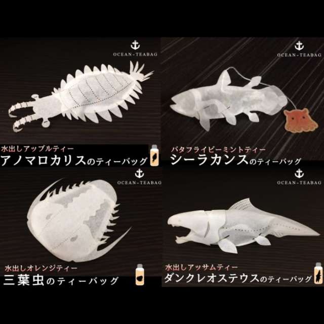 事實上,這系列的茶包不只有高腳蟹一種選擇,品牌「ocean-teabag」的名稱就說明了一切,他們從常見的鯊魚、水母、燈籠魚、翻車魚,再到現實中難以一見的皇帶魚、鸚鵡螺、扁面蛸……甚至連三葉蟲和腔棘魚這種古代生物都有!