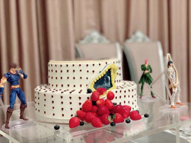 而蛋糕則是採用了《JOJO》布加拉提的設計,從拉開的拉鍊掉出來的莓果是一大亮點。