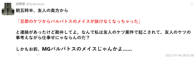 清晨五點半,朋友的老婆來訊「老公的屁股裡的獵魔鋼彈鎚矛無法拔除」,推主表示難受,一早起來就要為了朋友的屁股驚醒,還要想著這件事情工作,而且…為什麼是 MG 獵魔鋼彈的「鎚矛」…