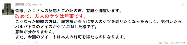 不過推主事後有發表聲明,針對不少人擔心的事情,朋友的屁股是沒有問題的。可能是因為老婆第一次玩這樣的花招,所以不小心把「鎚矛」塞進去出不來…,但我還是不懂。另外,這則推文是有經本人允許才發出的。