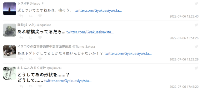 也讓網友表示這應該是個「令和ブラギガス事件」,「ブラギガス事件」是源自過去戰隊特攝作品《獸電戰隊強龍者》中的巨腕龍(ブラギガス,Bragigas),因為曾有日本特殊性癖的民眾購買該玩具後塞入體內送醫的新聞,造成這個角色在玩具界風評被害,一度讓人不敢購買。