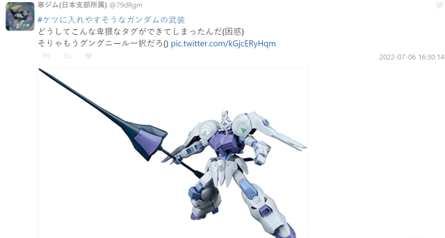 有興趣的網友可以在推特上搜尋 #ケツに入れやすそうなガンダムの武装,或許會有你想看的更多推薦內容。至於…鋼普拉是不是該這樣玩,小編是…不建議啦 XD。