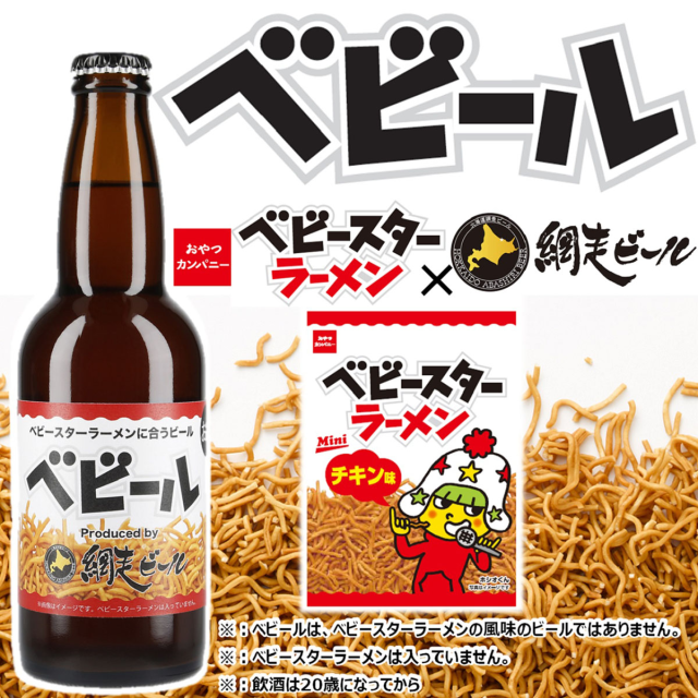 北海道啤酒廠「網走啤酒」與知名零食「星太郎點心麵」合作推出了與點心麵最搭的神奇啤酒「ベビール」。可別誤會這是點心麵口味的啤酒或是添加點心麵在內的啤酒,而是與點心麵經典雞汁口味味道最搭配的啤酒,休息時間吃一口點心麵再來口「ベビール」感覺就是舒服啊!