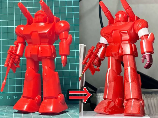 在塗裝前,推主 Cody 也進行稍微的打磨,讓一些原本較為較為圓潤且暗沉的素體,更加有線條與色澤。也在四肢等細節部位更替了零件,讓整體更有原畫的質感。