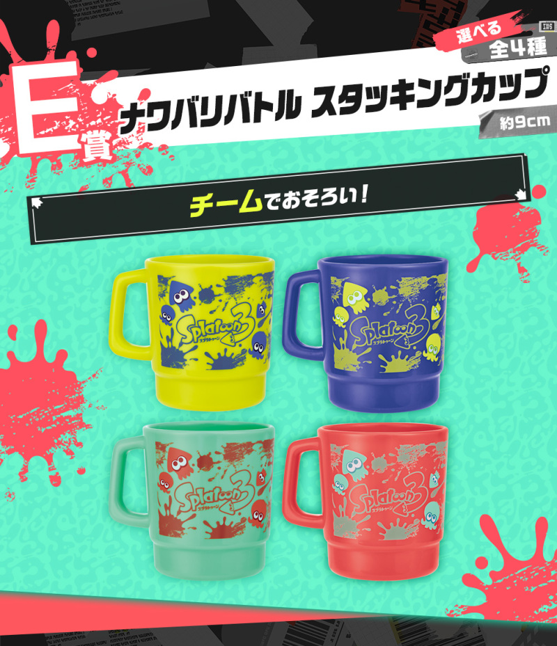 高約 9cm 的可堆疊式馬克杯,採用占地對戰中出現的四色漆料進行設計,印有『斯普拉遁3』LOGO圖樣。