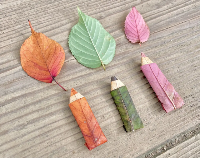 inori 其實是從事花卉創作&藝術品的「New草花あそび研究所」所長,經常在推特上分享創意作品,當然都取用自然的花卉或葉子來製作。而這次製作落葉鉛筆的想法,也是某日看到五顏六色的落葉,聯想到學生時代的色鉛筆,嘗試把這些不同顏色的落葉,製作成鉛筆的樣貌。
