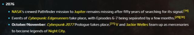另外,在《Cyberpunk》Wiki的時間線整理與節目統籌Rafal Jaki的回答中,也能夠明確看到《電馭叛客:邊緣行者》所發生的時間,與《電馭叛客2077》主角V返回夜城(街頭/遊牧民)跟阿傑組隊當傭兵,實際上是相隔不到幾個月的。