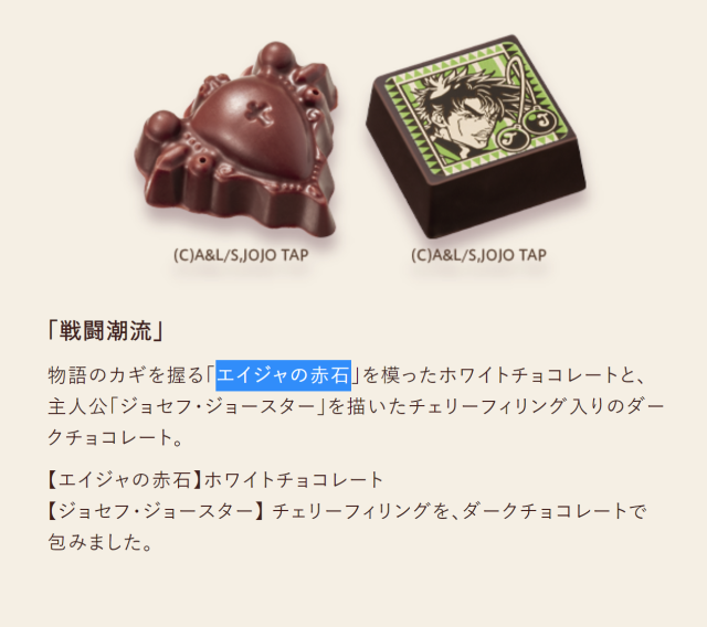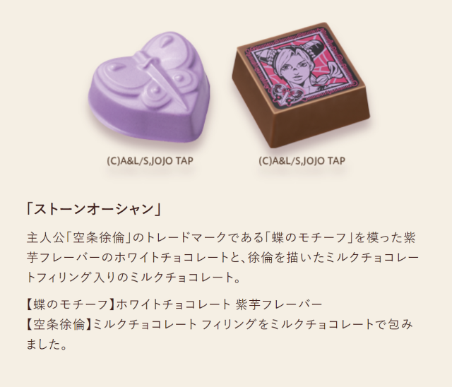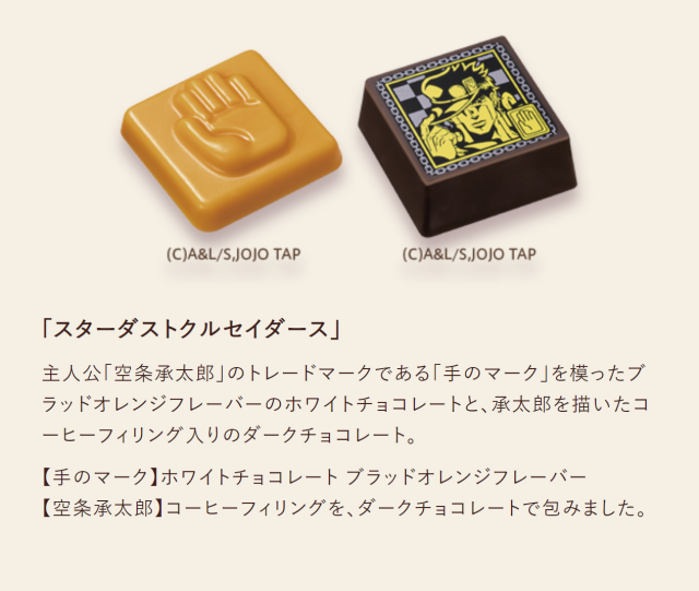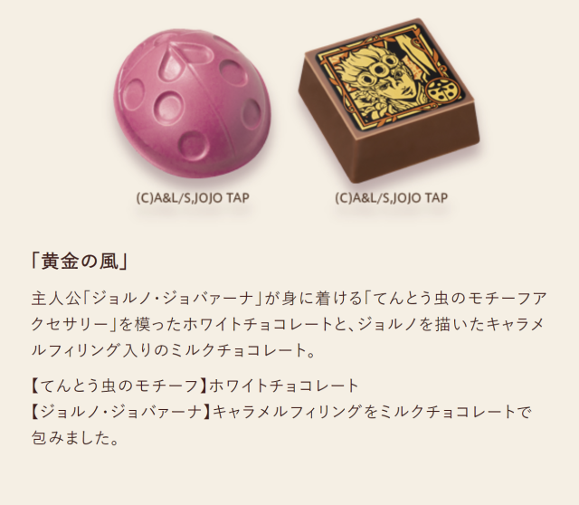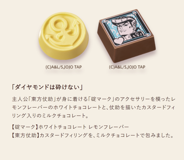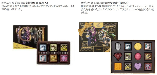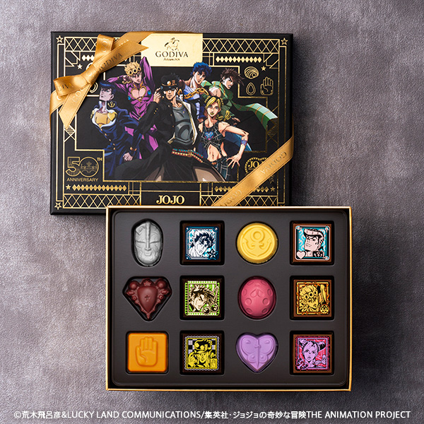 除了 GODIVA 在日本 50 周年外,也連同《JOJO 的奇幻冒險》動畫播出 10 周年,所以這次攜手一起推出聯名的巧克力,造型上分別以各部作品的代表物品與人物插圖來製作,絕對是值得粉絲珍藏的合作商品。