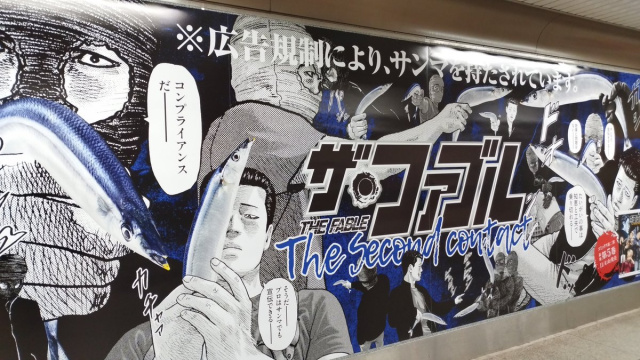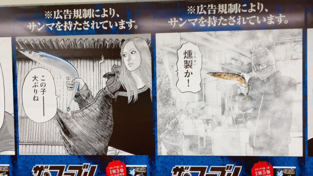 可以看到幾乎在車站走到舖設的廣告,上面也大方表示因為廣告規範的原因,將人物手持的都改為「秋刀魚」,頓時讓這部原本充滿殺戮之氣的漫畫成為了有點搞笑無厘頭的樣貌。