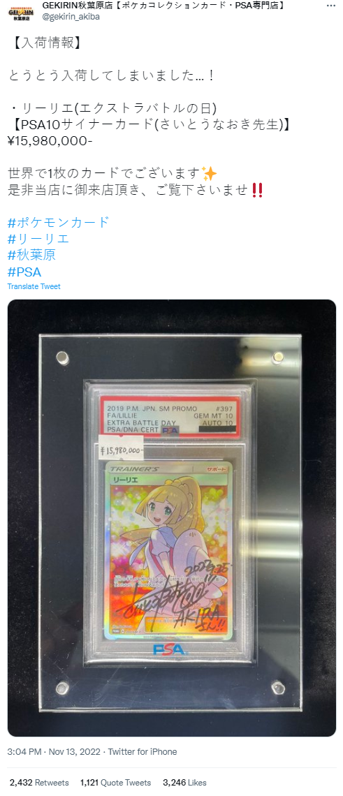 該卡片目前出現在秋葉原轉售店的推特上,標榜世界唯一一張,售價超過 1500 萬日圓,這樣的情況也讓網友替繪師感到難過,畢竟本於善意簽名的情況,居然最後落到轉售廚手上。