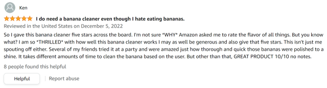 另外美國 Amazon 販售頁面更有買家評價 : 「我需要香蕉清潔機即使我討厭吃香蕉,在派對上真的玩得超刺激,絕對要給滿分評價 !!!」。看來這項商品絕對是各位狂歡派對裡的必備好貨阿 ( ? )