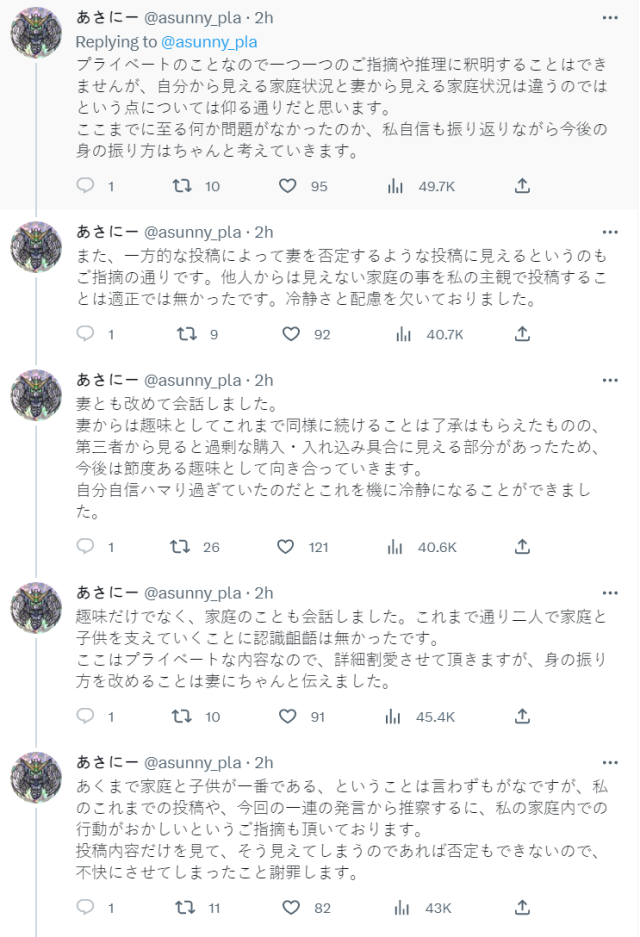 當然這種 PO 上網的情況都會被質疑只是單方說法,也有網友提醒他過於衝動可能會造成家庭破碎。後續推主也表示自己當時有點氣在上頭就發文到推特上,後許也跟老婆好好談論有關收藏與家庭的事件,一切都以家庭與孩子為重,未來會在收藏上酌量不過買過多,老婆也承諾會尊重他的興趣。
