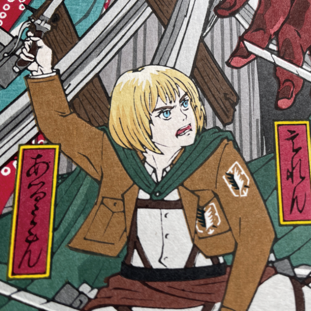 畫作中也將艾連、米卡莎、阿爾敏、里維、超大型巨人整個以浮世繪手法呈現,細節絕對是藝術品等級。