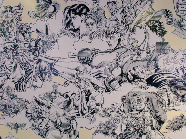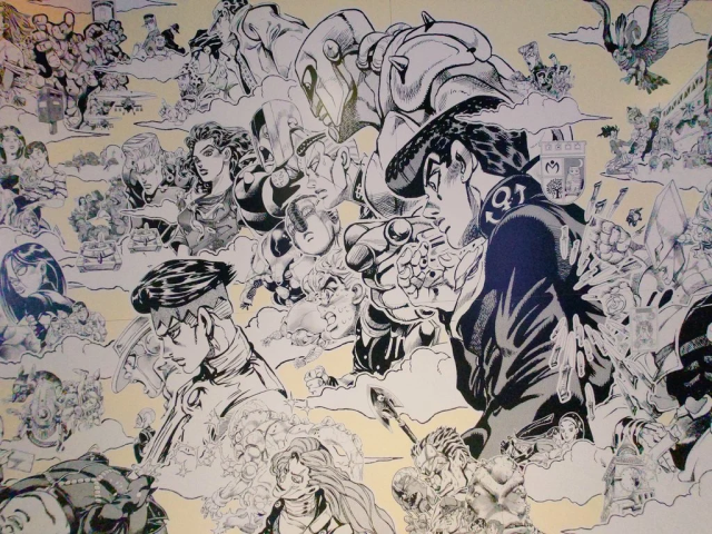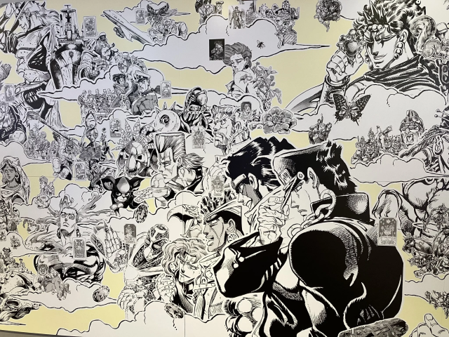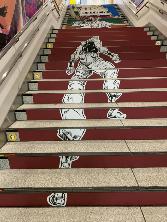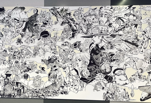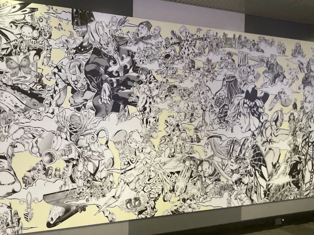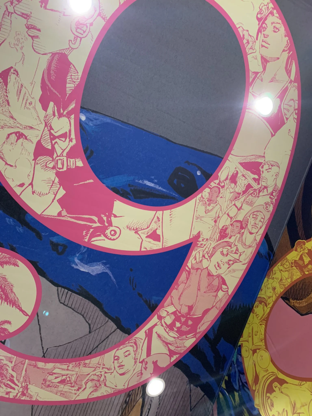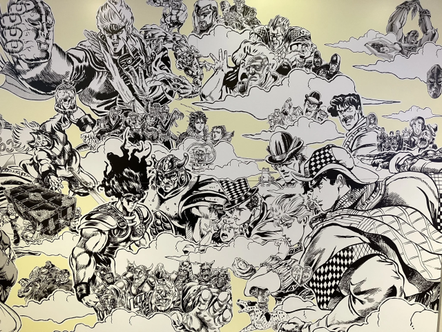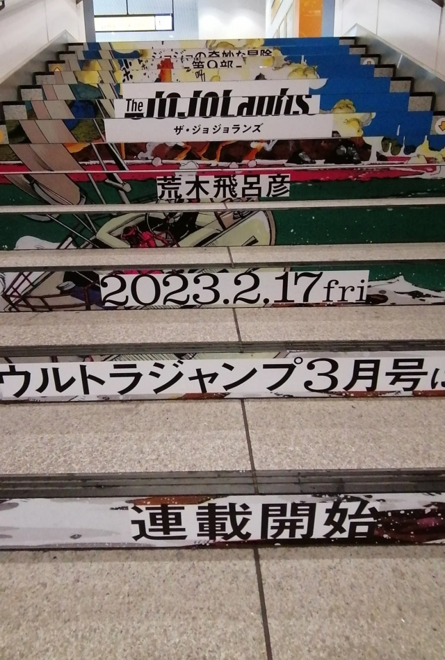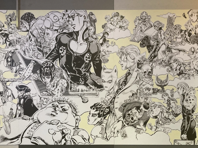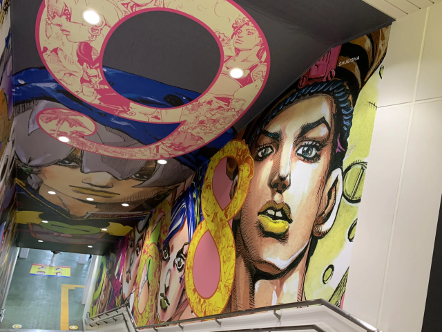 集英社直接在澀谷車站走道,放上從最新的第九部《The JOJOLands》一直到第一部的角色,由荒木老師繪製出這往如藝術品般的手稿巨幅廣告,各代人物滿滿的出現在上頭,仔細看還可以發現許多細節藏在裏頭。