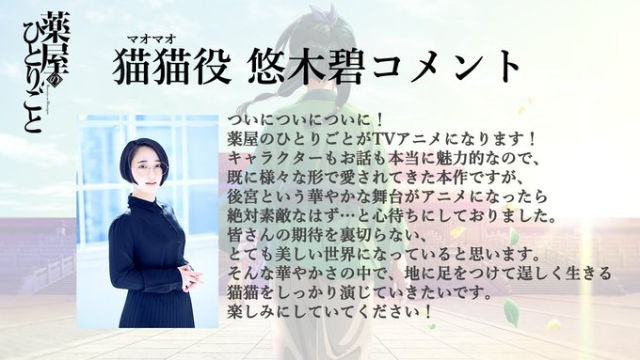 由日向夏所著、しのとうこ繪製插畫的輕小說作品《藥師少女的獨語》(薬屋のひとりごと) ,在今日 ( 2/16 ) 宣布將製作為電視動畫,並公開首部 PV,主角-貓貓(マオマオ)也確定由悠木碧配音,目前預定 2023 年播出。