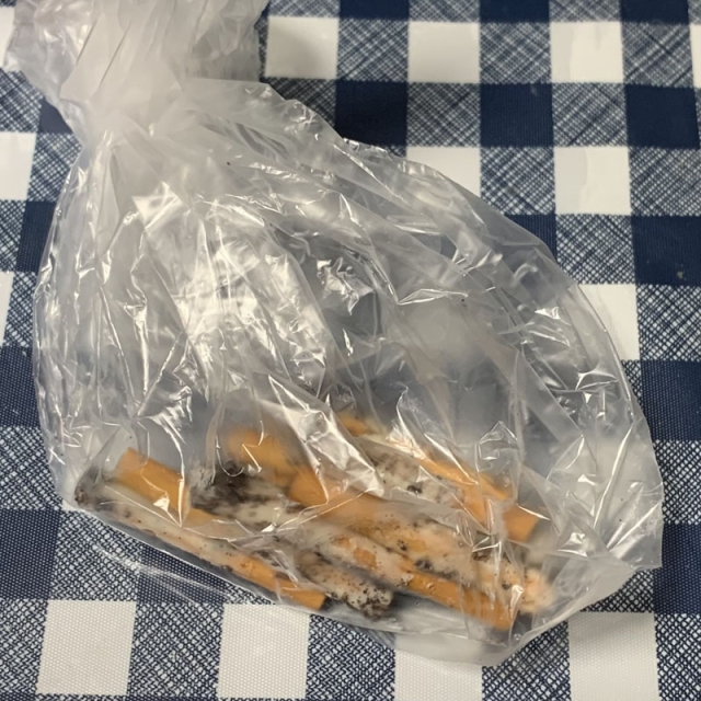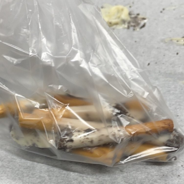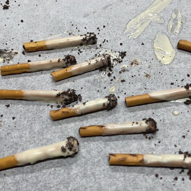 沒事啦,這真的是巧克力,只是是菸蒂造型,是推主女兒在TikTok上學到的食譜,將餅乾棒沾上白巧克力當作菸的本體,然後用OREO的餅乾碎當菸灰,這就成了菸蒂巧克力,畢竟推主家中並無吸菸者,會給真的菸蒂那還真是大不孝。