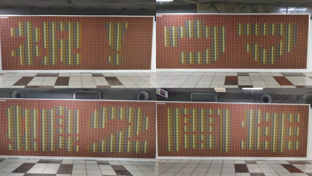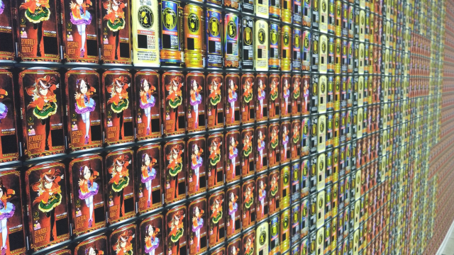 看板上排出「祝 ! 賽馬娘 2 周年」的圖案外,裡頭更是用兩方合作的飲料罐堆疊而成,細細的看非常壯觀,也附上開發擔當人員的話語,希望能推給馬娘粉更多商品,也實踐自己的心願。