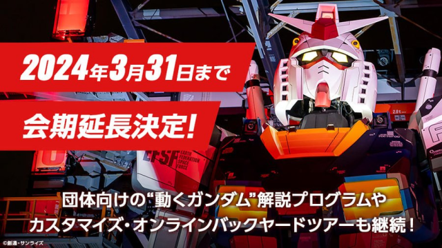 自 2020 年起開幕的橫濱山下埠頭「GUNDAM FACTORY YOKOHAMA」,一直以來都是世界各地鋼彈粉絲朝聖的地方。先前宣布因為規劃關係決定在今年 3 月底落幕,不過因為國內外粉絲熱切殷求,官方決定將延長至 2024 年 3 月,讓因為疫情不能前來的粉絲能夠有更多時間來欣賞。