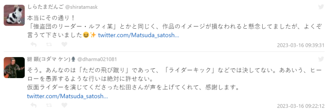 連《假面騎士龍騎》飾演秋山蓮的松田悟志也發布推特表示,不希望這些特攝英雄崇高的絕技用在這種社會迷惑行為,毀壞騎士的名譽;如果自己見到這樣的行為發生在眼前,我會給他一記騎士踢的 ! ( 松田好帥阿~XD )