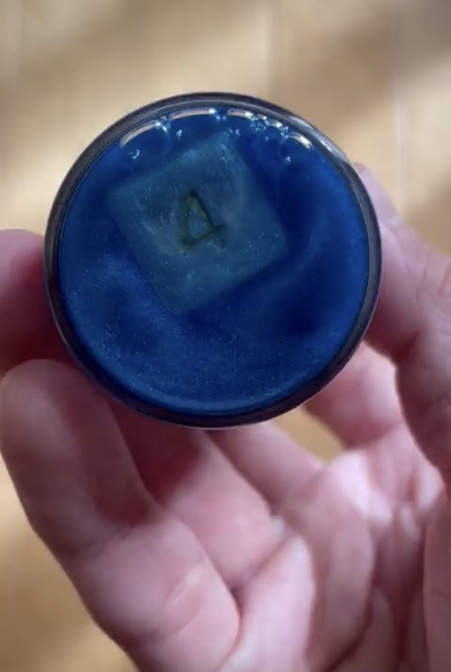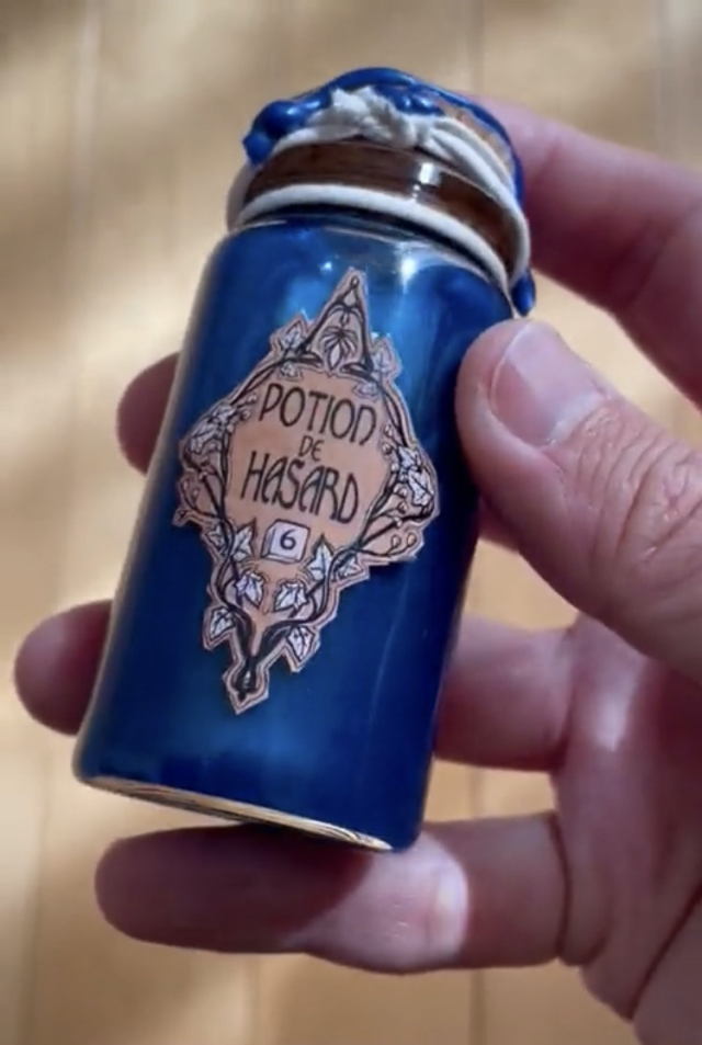 日本一位推主たかみまこと(@hanon_leaf)在法國坎城舉辦的「坎城國際遊戲展」中的TRPG攤位上買到一個很特別的六面骰,這骰子的「本體」是藏在瓶子中,而只要搖晃瓶子就等於是「擲骰子」的動作了,而擲出的數目則會顯現在瓶底,這種設計很有創意也很有趣,而且瓶子的設計有如奇幻作品中的小藥瓶一樣,裡面還裝著藍色的混濁液體,感覺特別適合用來當「龍與地下城」或「劍世界」(Sword World)等TRPG作品。