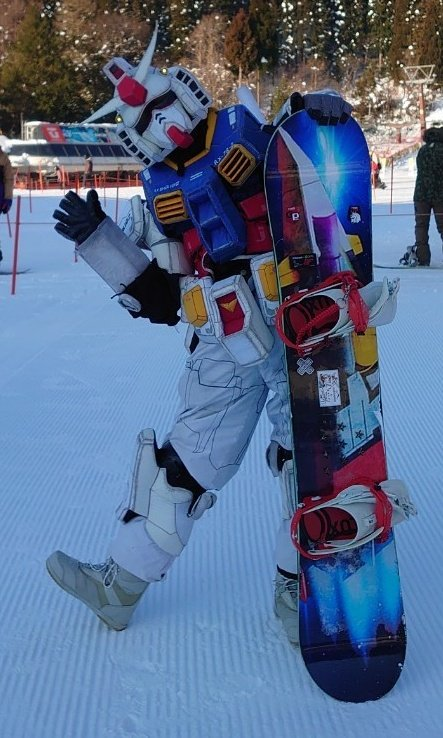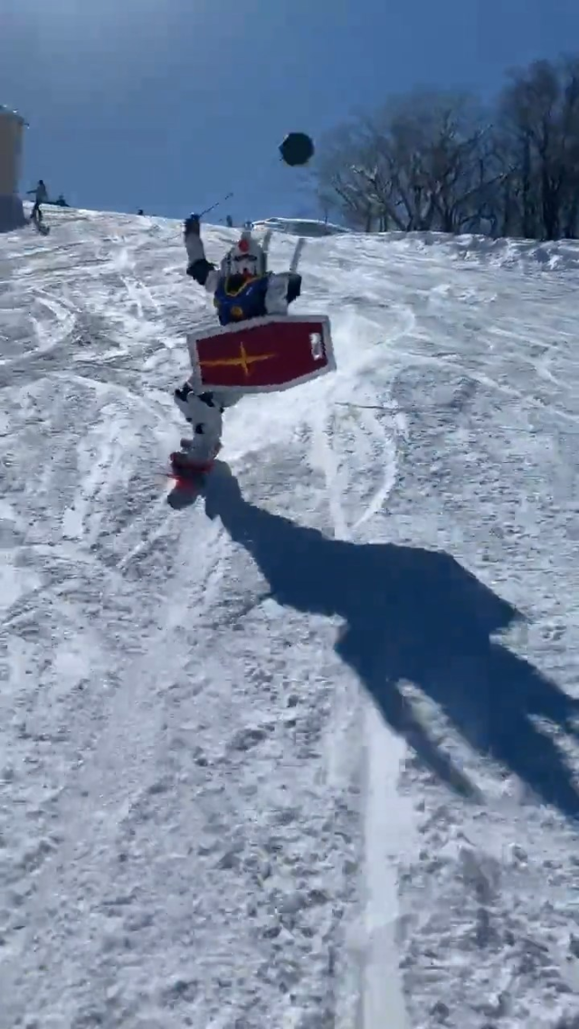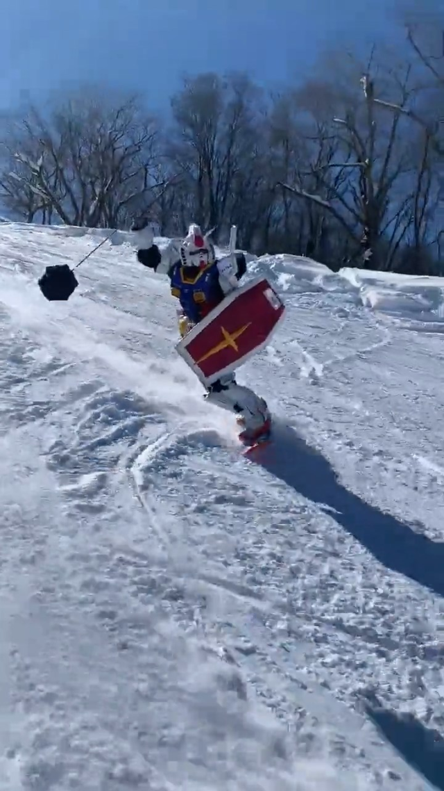 這是由日本一名推主RYO(@okiyama69)所拍攝到的畫面,只見一架聯邦的「白色惡魔」手持「鋼彈錘」,一邊揮舞錘子一邊滑雪,而且滑雪技術還挺熟練的,即使雙手一隻揮舞錘子一隻持盾也不會影響到動作,漂亮的滑雪技巧和一身RX-78-2裝扮也成為雪地上的唯一焦點。