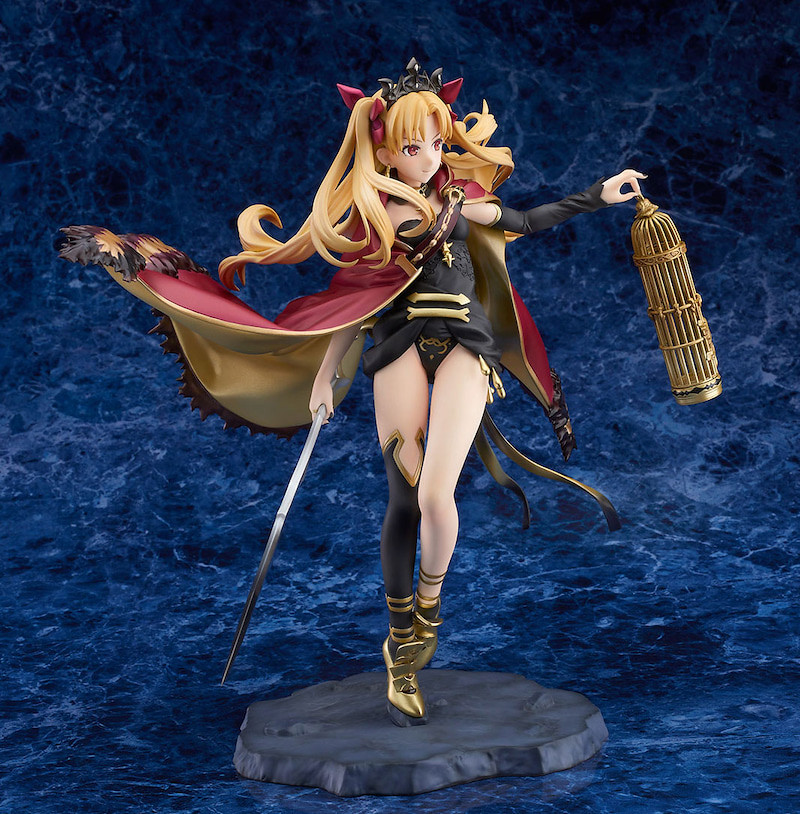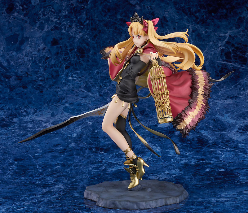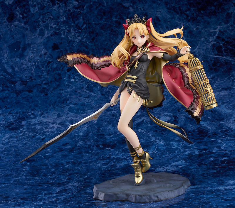 「Lancer/艾蕾什基伽爾 1/7比例模型」依據遊戲中第一再臨的插畫製作,將手持槍與鳥籠、展露高傲笑容的姿態立體化。造型細膩雕塑出躍動的頭髮零件與披風,並刻畫了服裝上的花紋、披風邊緣的絨毛、多處骷髏造型飾品。運用消光黑與金色塗裝讓服裝顯得高貴,而披風內外分別使用暗紅、金色塗裝,更加顯現冥界女神的魄力與威嚴!