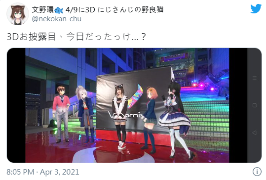 「V-Carnival実行委員会」連續於4月3日-4月4日推出不同的Vtuber進行表演,總計超過1000萬訂閱數的世界頂級嘉賓獻上舞台歌曲,使用全AR技術和華麗的CG來詮釋演唱會,其中也包含MC橋段與特別來賓登場–「えなこ」cosplay「文野環」的可愛程度引起話題,讓不少粉絲表示「這個3D化POLY數有點高!」