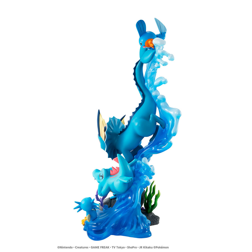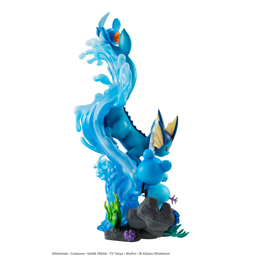 G.E.M.EX 水屬性寶可夢 DIVE TO BLUE」由水伊布、水躍魚、瑪力露、烏波、小鋸鱷、墨海馬等六種藍色的水屬性寶可夢組成場景,細膩刻畫出寶可夢各具特色的造型與享受玩樂的歡愉神情,底座藉由水流特效使作品充滿躍動感,並製作出礁石、珊瑚等物件,讓人更加融入水屬性寶可夢的生態!