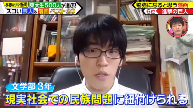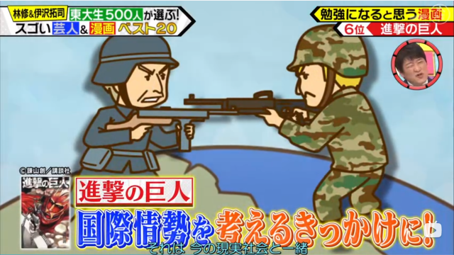 在節目中,製作單位邀請了500名東京大學的學生,投票選出自己認為最具有教育性質的漫畫,其中《進擊的巨人》就以排名第6的位置,進入了此次的排行名單之中。