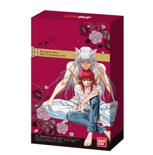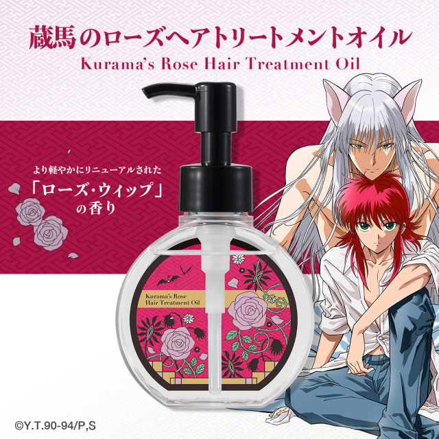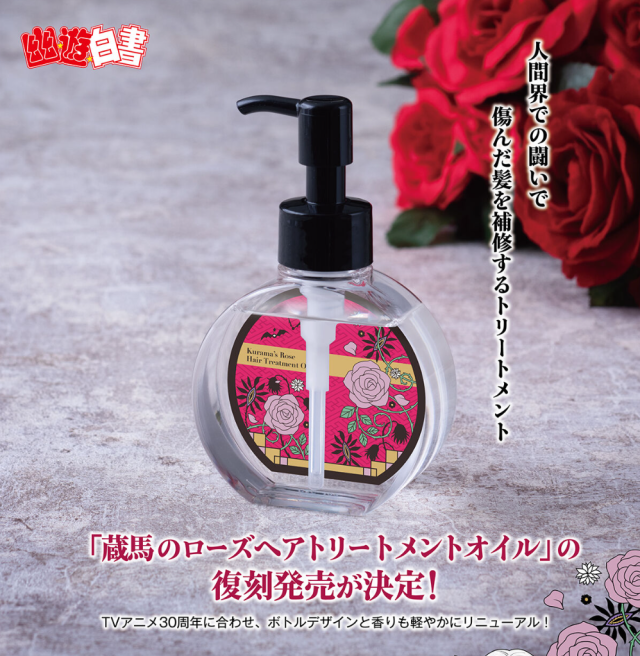 事實上過去萬代就曾推出過南野秀一 ( 藏馬 ) 的該款玫瑰護髮油,這次改為動畫 30 周年紀念款,瓶裝改為代表妖狐的魔界植物插圖,更繪製了妖狐藏馬的宣傳圖,給藏馬粉絲另一個選擇。