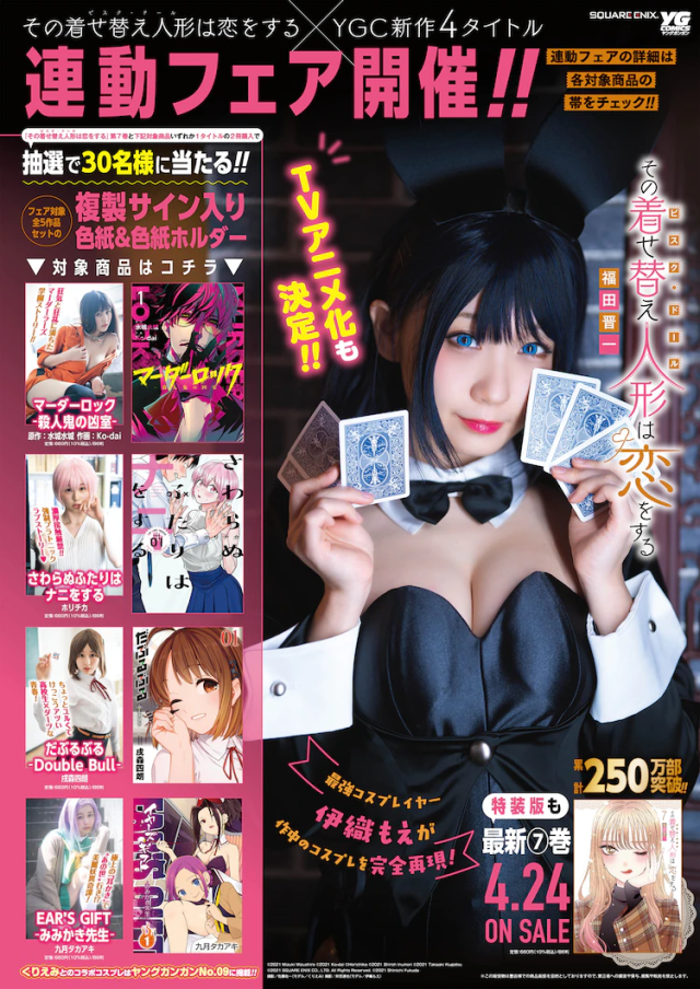 另外在今日發售的《YOUNG GANGAN》No.09 上為了紀念《戀上換裝娃娃》的電視動畫化決定,官方請來了知名 Coser 伊織萌 跟這部作品的第三彈合作,呈現出了在作品劇情中女主海夢曾經挑戰過的各種 Cosplay 形象。