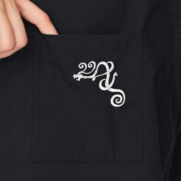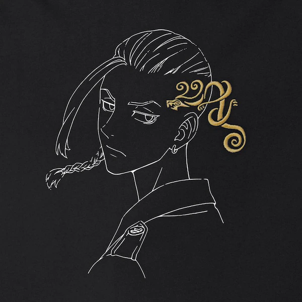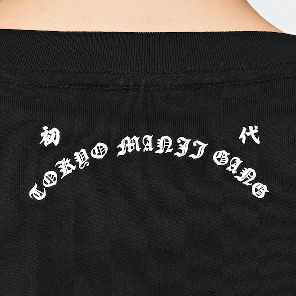 此款背後採用 Draken 漫畫中私服穿著的法披服飾的民俗圖騰,正面口袋處則放有其頭上的刺青圖案。