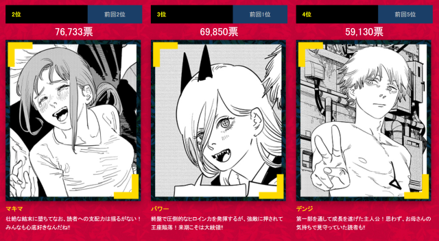 由週刊少年 JUMP 官方所舉辦的漫畫《鏈鋸人》人氣投票,相較上次投票時漫畫第一部公安篇尚未完結,本次為第一部完結後展開的二回投票,總共收集了超過 62 萬的票數,相較上次 23 萬大幅成長,可以看到《鏈鋸人》作品的人氣上漲程度不容忽視。