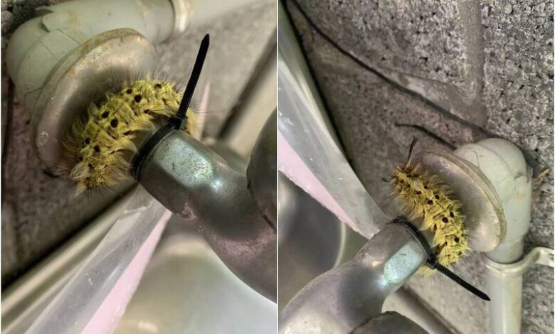 不少民眾害怕毛毛蟲,1名網友分享,她早上到公司洗手台洗杯子時,忽然發現1隻超大黃綠色疑纏繞在水龍頭上,驚訝之餘特別將此拍照上傳至社群平台,貼文曝光後引起不少網友討論與留言。