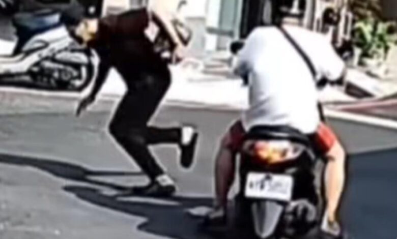 影片中一名阿伯騎車右轉時,疑似不小心撞倒一名準備過馬路的路人,沒想到這名路人竟是剛搶 銀樓的搶 匪。隨後銀樓店員追了出來,立刻將搶 匪攔下,並要求對方不要動,同時呼喊其他路人幫忙報 警。而這名阿伯從頭到尾並未離開現場,不久後多名警 員趕到,將搶 匪壓制並帶回,阿伯才騎車調頭離去。