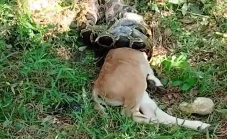 廣東汕尾陸河縣一處山腳下,近日驚現蟒蛇吞牛的驚人場面,消防人員接獲報案到場處理,已將蟒蛇放生,但牛已無生命跡象。事件引起中國網友一面倒批評,質疑「為什麼放生?」「下次讓牠吃人嗎?」