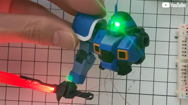 再來是改造的部分,他要讓EFREET的光束刀和眼睛發光,所以開始用到了LED接線的技能,他很細心地將線嵌在零件內側並重新組裝起來,然後再經過測試就完成了發光特效,再接著是細部改造和重新塗色,本鄉要把它塗成全黑,而在細部改造的時候有出了點小差錯,不過他也有補救方案,拿備用的零件來做替代,待所有零件都塗色完畢並風乾好了,細部也改造完了,然後重新組裝就完成了本鄉版EFREET了!