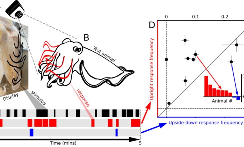 圖片展示了科學家如何測試烏賊(Sepia officinalis)是否能「看懂」其他烏賊的揮手手勢。研究人員播放影片給烏賊觀看(A),影片中是另一隻烏賊在做出特定的揮動手勢(如紅色標記)。當畫面是正的時候,測試中的烏賊會模仿揮手(B、C紅色區段),但當影片上下顛倒播放時,烏賊的反應次數明顯減少(C 藍色區段)。右圖(D)顯示多隻烏賊的統計結果,大部分在觀看正立畫面時的反應頻率較高,暗示這些揮手可能真的是一種視覺訊號溝通。圖/ bioRxiv