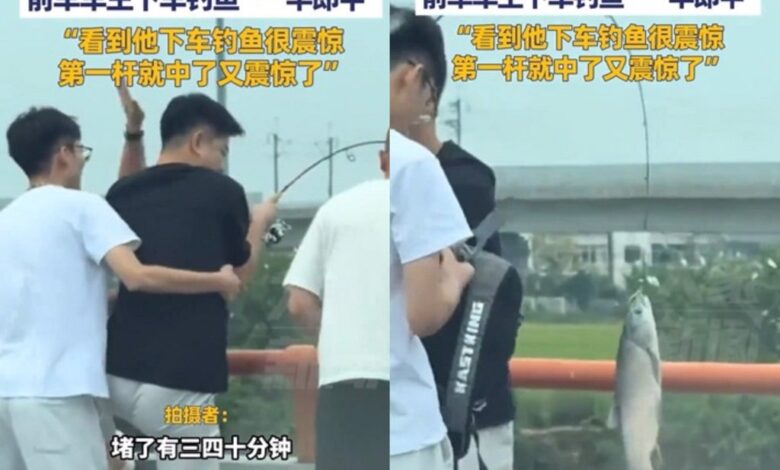 拍攝這段影片的女子接受媒體訪問時表示,當時塞車很嚴重,堵了快40分鐘都不會動,突然看到男子下車從後面拿出魚乾,他下車往旁邊河道隨手一拋,一開始也只是好奇用手機拍下,沒想到真的讓他中大魚,隨後男子還跟女子要影片,而這段影片發到網路上引發網友熱議。