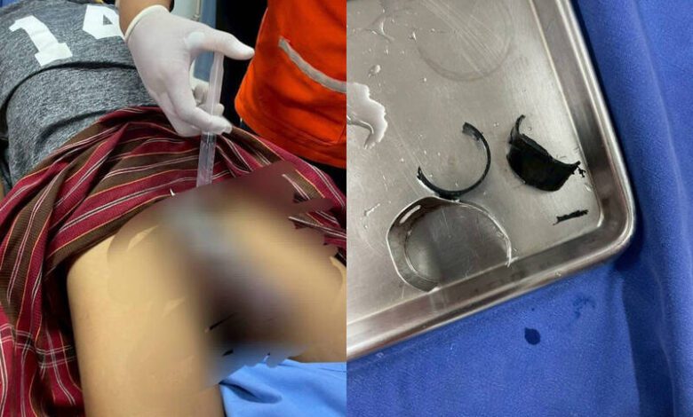 救援人員趕抵現場後發現,男子下體被一個塑膠環與一個疑似釣竿部件的不鏽鋼環緊緊箍住,導致陰莖腫脹如拳。隊員小心使用砂輪機逐步切割,歷時約10分鐘才成功取出兩個環,但男子的下體仍明顯腫脹,隨即被轉送武里南中央醫院進一步治療。