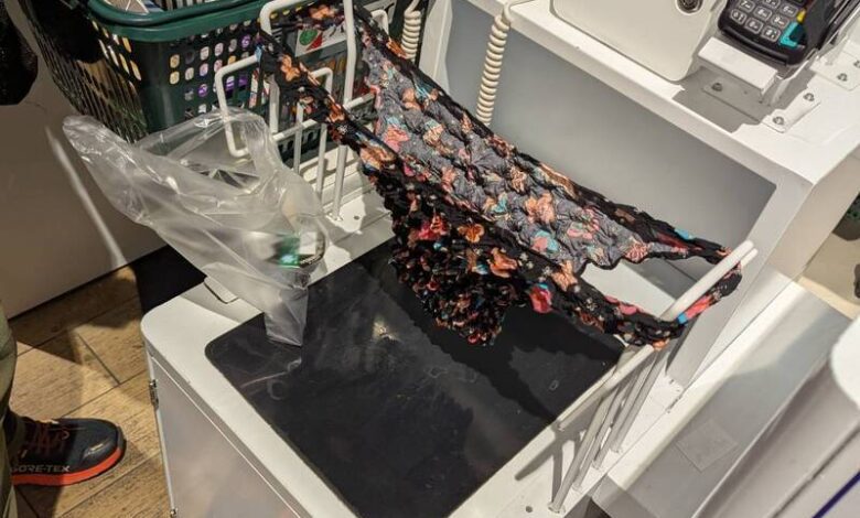 無獨有偶,另一位網友的媽媽購買花色款式,在超市架在自助結帳機時,看起來更像是在曬內褲。留言區紛紛贊同「根本是內褲」,有網友放大給5歲的小孩看問是什麼,小孩秒回「是內褲」、也有網友認為是花色的問題。