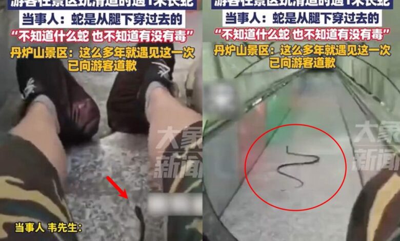 很多大型風景區內因為占地廣闊,加上風景區都位於山區,出現一些自然野生動物一點也不奇怪,近日有名男子在景區玩溜滑梯,突然被一隻小蛇超車,男子當場嚇傻,所幸當下沒被咬,直呼「真刺激」。