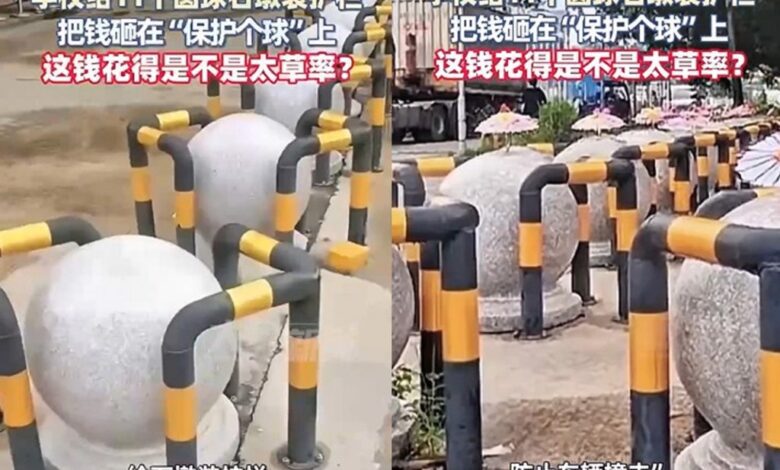 這起特殊的事件發生於廣東省的嶺南工商第一技師學院大門外。據了解,當初為了美化校園景觀,特別在校門口擺放了總共十一個圓形石球,此舉同時也能夠防止車輛不慎闖入校園內部。然而,近日校方卻耗費了一筆資金,在這些圓形石球的兩側,額外加裝了鐵製的防護欄杆,並聲稱這是為了保護石球本身,這樣的做法讓許多人質疑,這筆經費的花費是否過於草率。