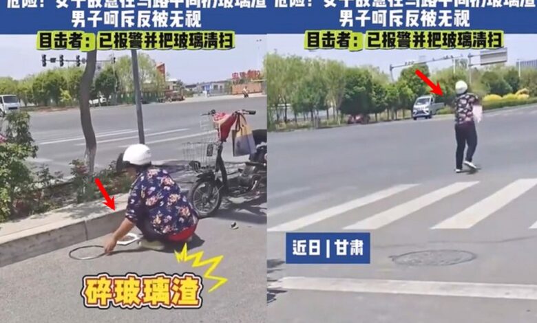 這個老太太在馬路上撒碎玻璃的事件發生在甘肅,當時路人發現她在路邊敲擊碎玻璃,感覺要做壞事,停下來用手機錄影,沒想到真的敲完碎玻璃後,直接走上大馬路,將碎玻璃撒了滿地。