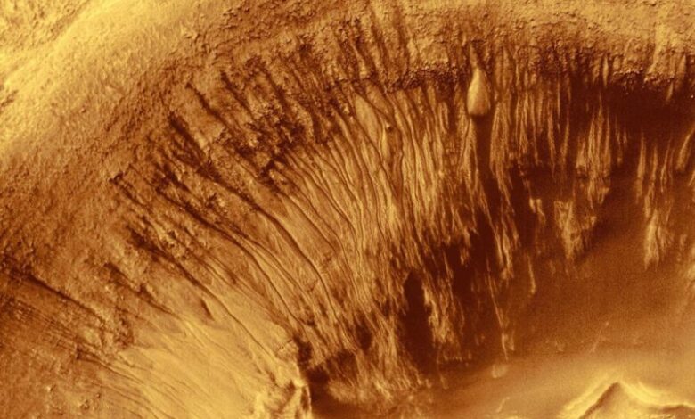 在火星 Russell、Matara 撞擊坑內,被風掠過的沙丘出現緞帶般長溝槽,兩側有隆起邊緣,蜿蜒地向下延伸,並終止於一個個整齊坑洞,看起來就像生物刻意挖掘。